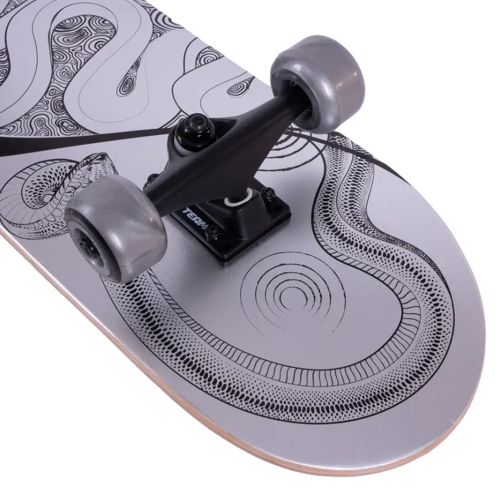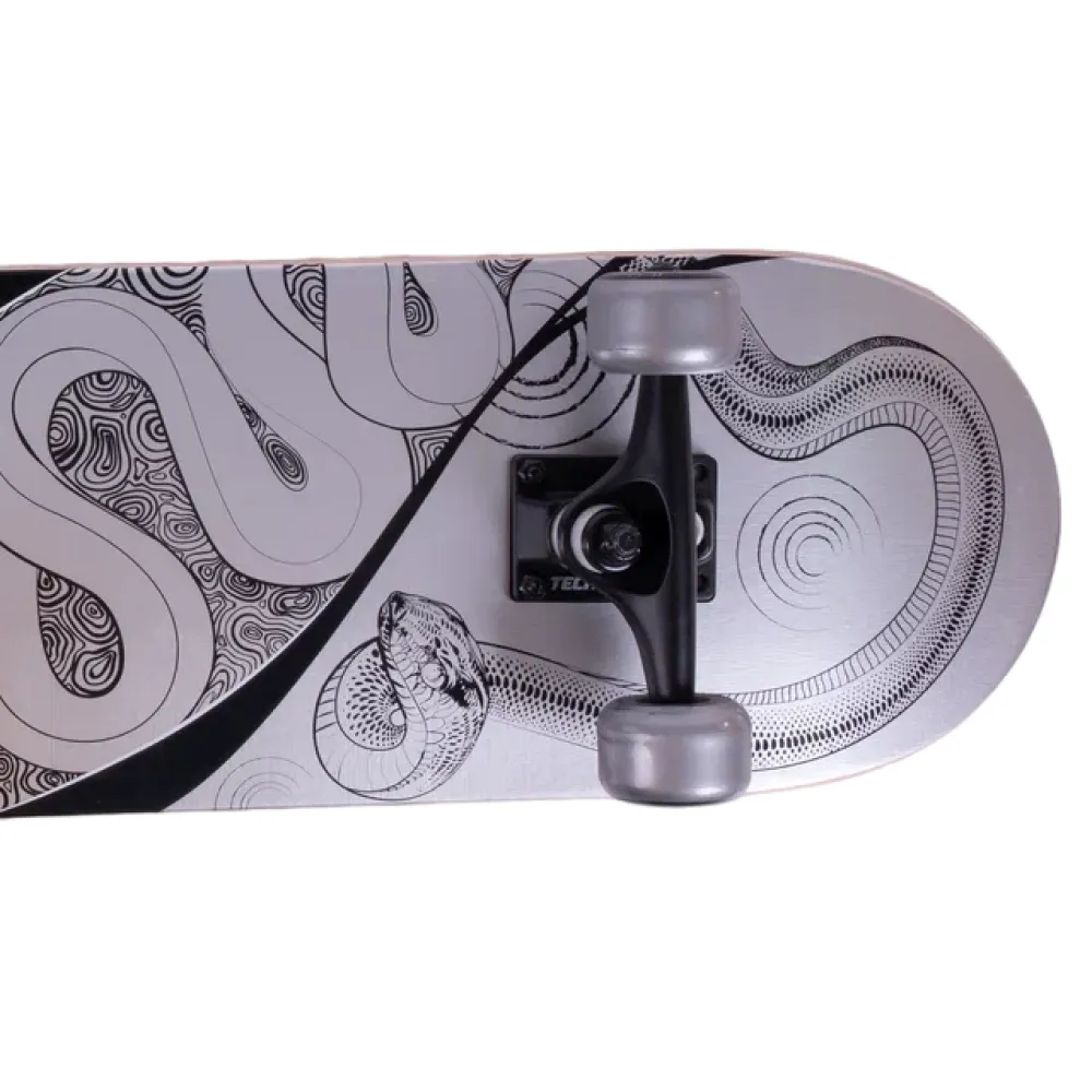 Нижняя часть деки украшена крутым принтом в серо-хромовом цвете со змеей, что подчеркивает бунтарский стиль Bad Boy. С этим скейтбордом вы точно привлечете внимание! Дека имеет двойной концевой загиб (Double Kick), что позволяет выполнять сложные трюки с легкостью.