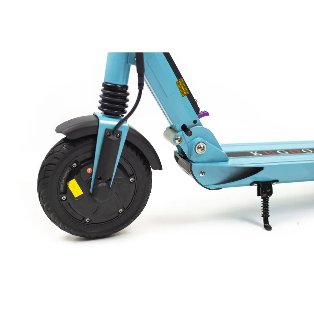 Электросамокат имеет два тормоза как на переднем, так и на заднем колесе. Уверенная сцепка с дорожным покрытием обеспечивает не просто мягкое катание, а уверенное преодоление неровности дорожного покрытия. Аккумулятор самоката заряжается от сети, от полного разряда до 100 % необходимо заряжать четыре часа. На одном заряде электросамокат может проехать до 26 км.
