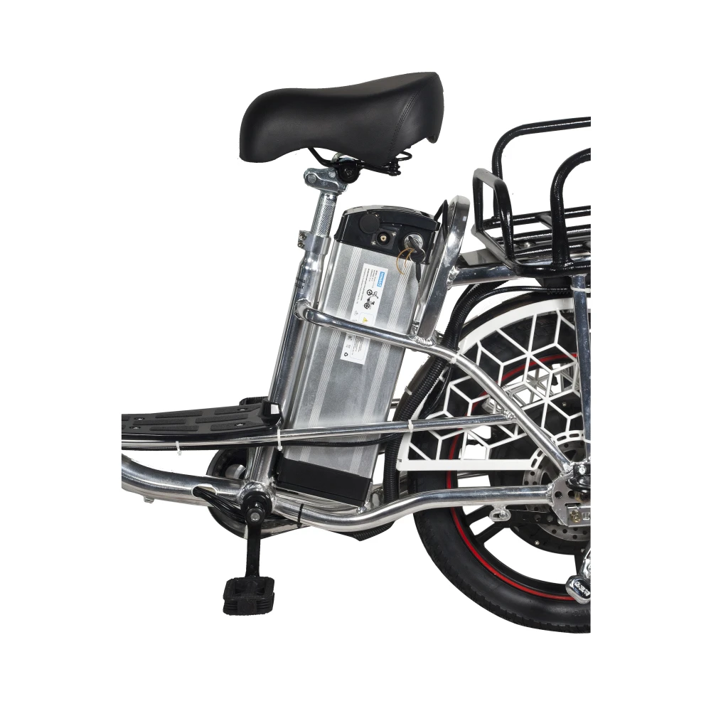 Электровелосипед изготовлен из сверхпрочного алюминия, не теряющего первоначальных характеристик при соблюдении требований производителя. Оснащена мотором мощностью 500 Вт, который в сочетании с емкой АКБ способен развивать скорость до 20-50 км/час и преодолевать до 80 км пути. Гидравлическая тормозная система, профессионализм райдера и надежно сцепляемые с грунтом внедорожные колеса обеспечивают безопасность движения райдера.