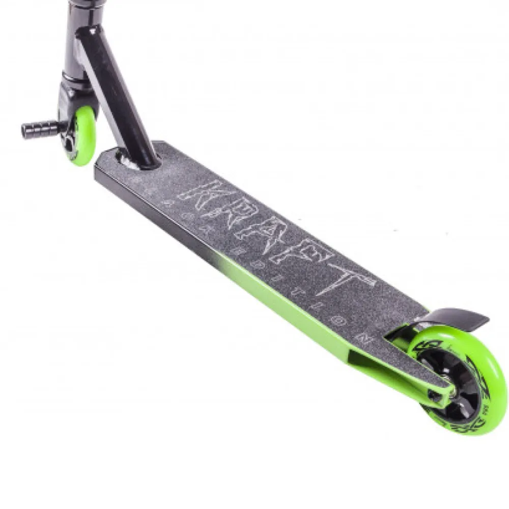 Самокат трюковый KRAFT BLACK EDITION черно-зеленый – супертехника с закаленной современной декой из высокопрочного авиаалюминия 6061 придется по душе продвинутым пользователям, ценящим повышенный комфорт при исполнении смелых трюков. Легкость (3,55 кг) и шустрость обеспечивается полузакрытой (кассетного типа) рулевой нового поколения. Колеса диаметром 100 мм имеют особую жесткость 88 А. Внедрение алюминиевой ступицы и зажимы с четырьмя болтами делают технику особенно привлекательной для пользователей. Езда на трюковом самокате разнообразит скучные дни райдера, внесет свежие краски в проведение досуга. Наш интернет-магазин предлагает гибкую систему скидок и накопительную программу бонусов.