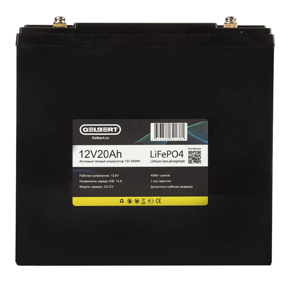 Литиевый тяговый аккумулятор Gelbert LiFePO4 (12V/20Ah/20A/240Wh) [6-DZF-20, 6-DZM-20]