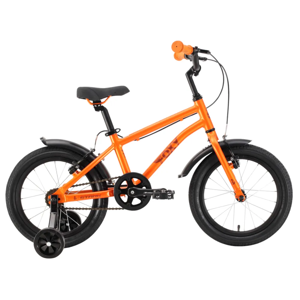 Велосипед Stark'22 Foxy Boy 16 оранжевый/черный также оснащен двумя детскими колесиками, которые обеспечивают дополнительную стабильность и помогают детям уверенно осваивать навыки велосипедной езды.